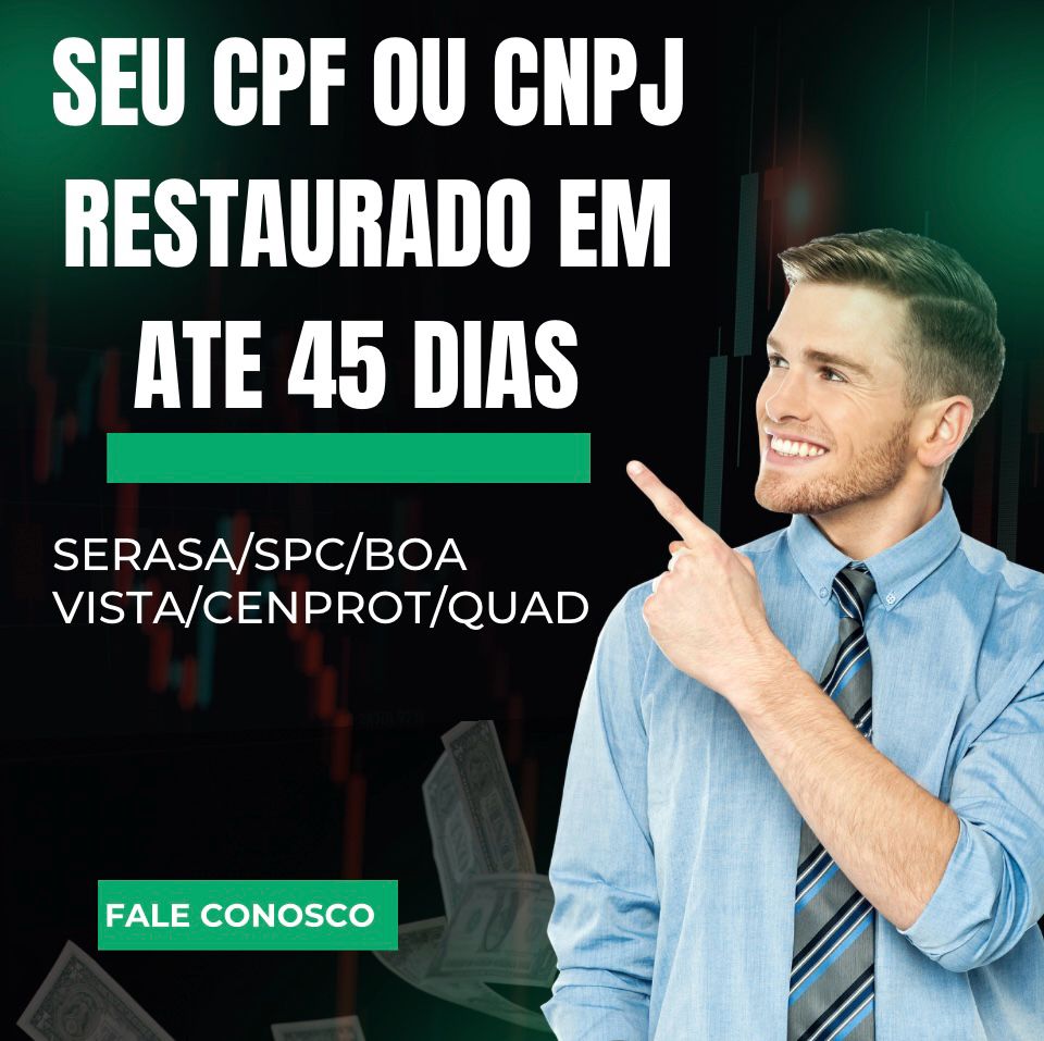 🔹 Limpeza de Nome em tempo Recorde: Nós limpamos seu CPF e CNPJ, removendo todas as restrições e permitindo que você volte a ter crédito no mercado, mesmo antes de quitar suas dívidas!